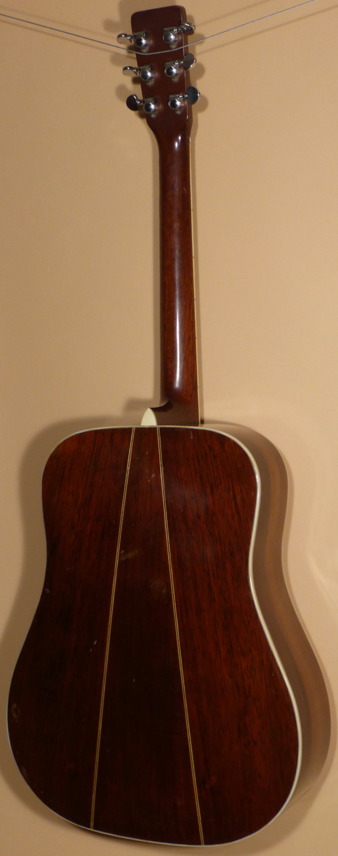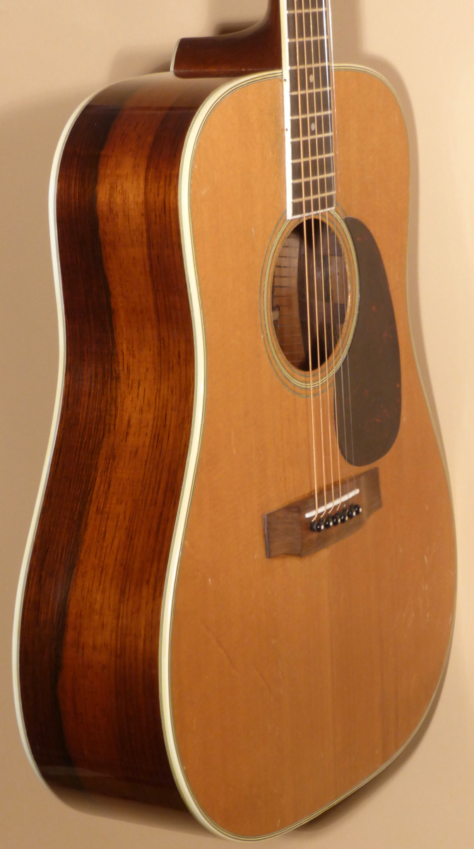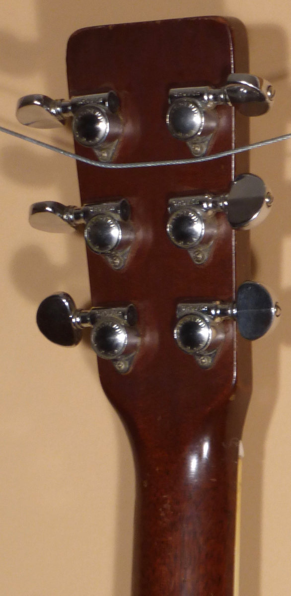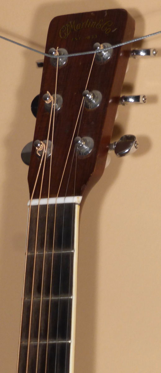 The Brazilian Rosewood peghead veneer has the Martin & Co decal logo at top. Tuners are the original NickelĀ Grover Rotomatic Patent Pending closed back tuners. Top end of peghead has slight bumps in lacquer. The Honduran Mahogany neck has full modified U profile. New Bone Nut. Ebony fretboard has been milled and trued-up. Graduated pearl dot inlays in fingerboard. Bass side of F.B. has side dots in the binding for position markers.