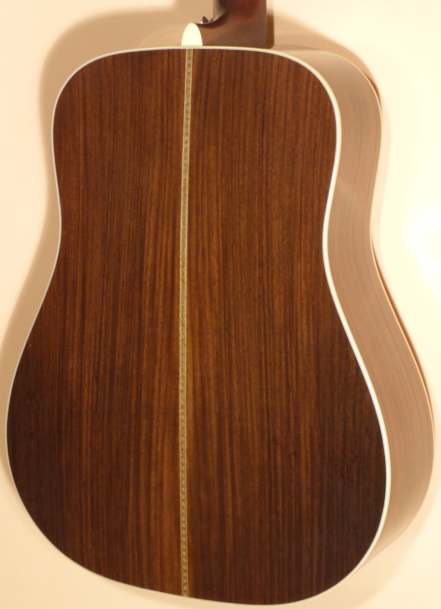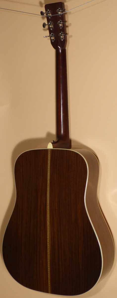The Spruce top has scattered dings and scratches, as well as four professionally repaired cracks. Ebony bridge with bone bridge pins and saddle. The soundhole is larger than a typical D-28. It was recut after it left the factory by a highly professional local Luthier. We believe this work greatly enhanced the sound of this dreadnought. Tortoise pickguard, and herringbone purfling before the cream binding on the top edge. The Indian Rosewood back and sides show similar player wear to the top, with a fair amount of dings and scratches. Two-piece back separated by a “Zipper” backstrip. Creem end wedge with end pin installed.