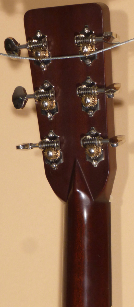 The Rosewood peghead overlay has the standard “Martin & Co. EST. 1833” decal at the top. Nickel Waverly tuners with lobed buttons. Bone Nut. The Ebony fingerboard has pearl dot inlays and cream side dot position markers. The rounded “V” profile neck is shaped very nicely, with only a few light dings. Diamond volute, cream heelcap. Nickel strap button installed.