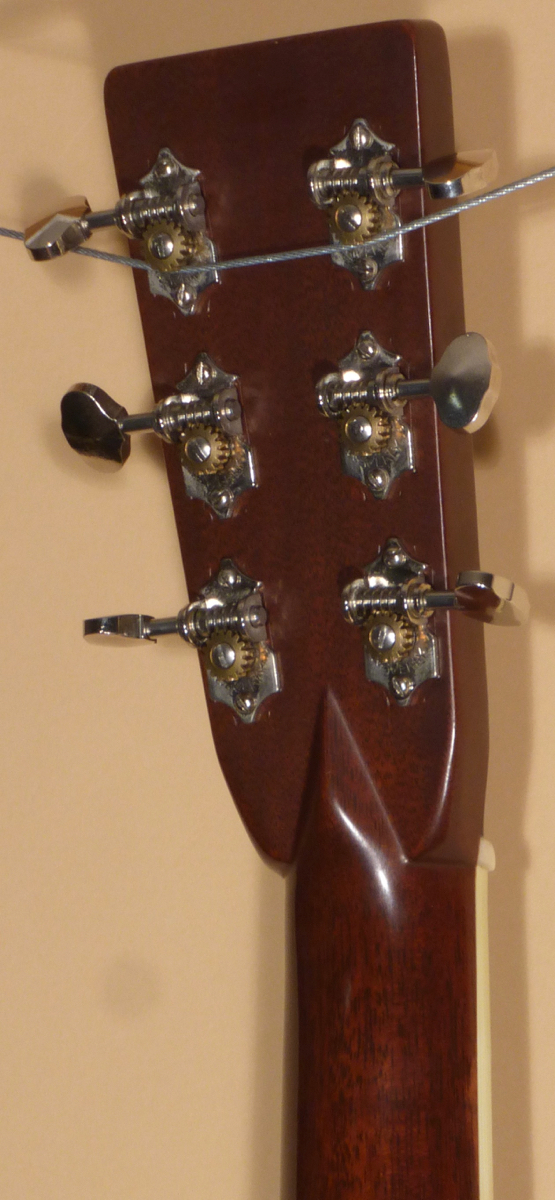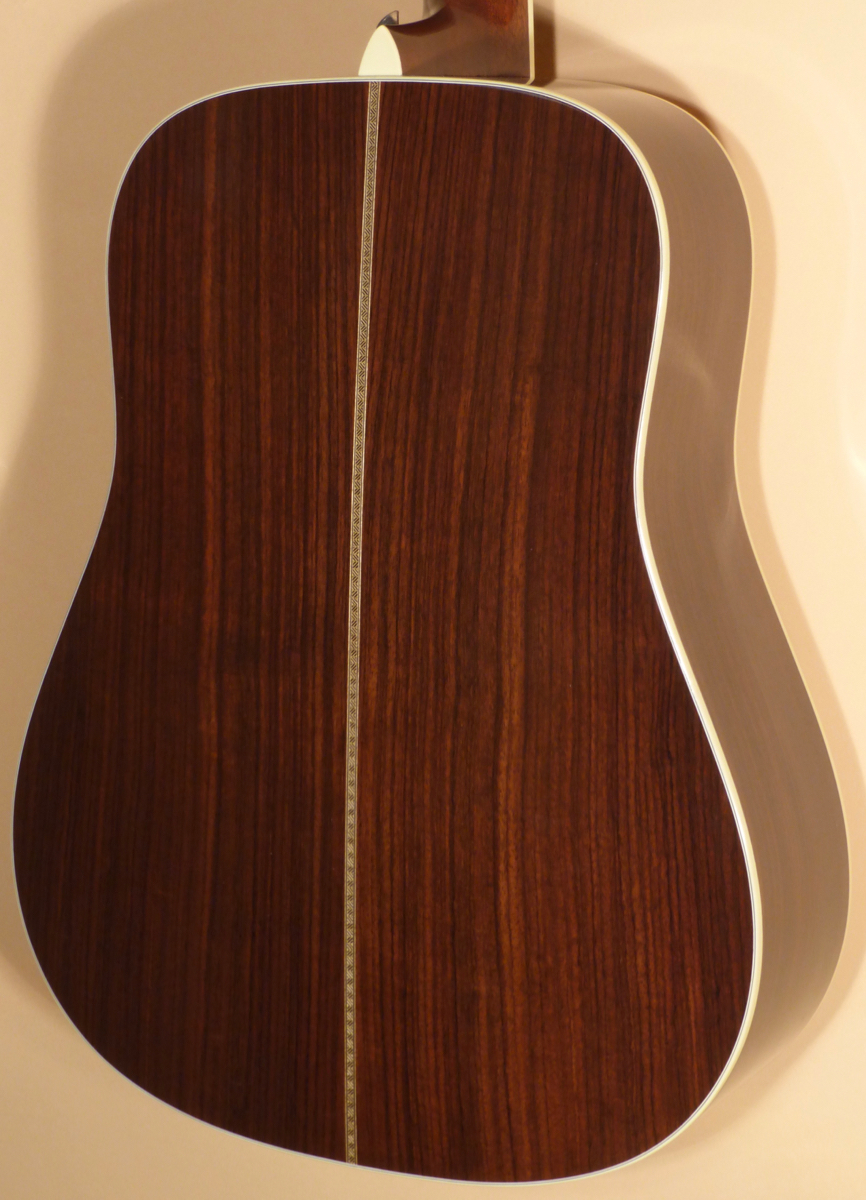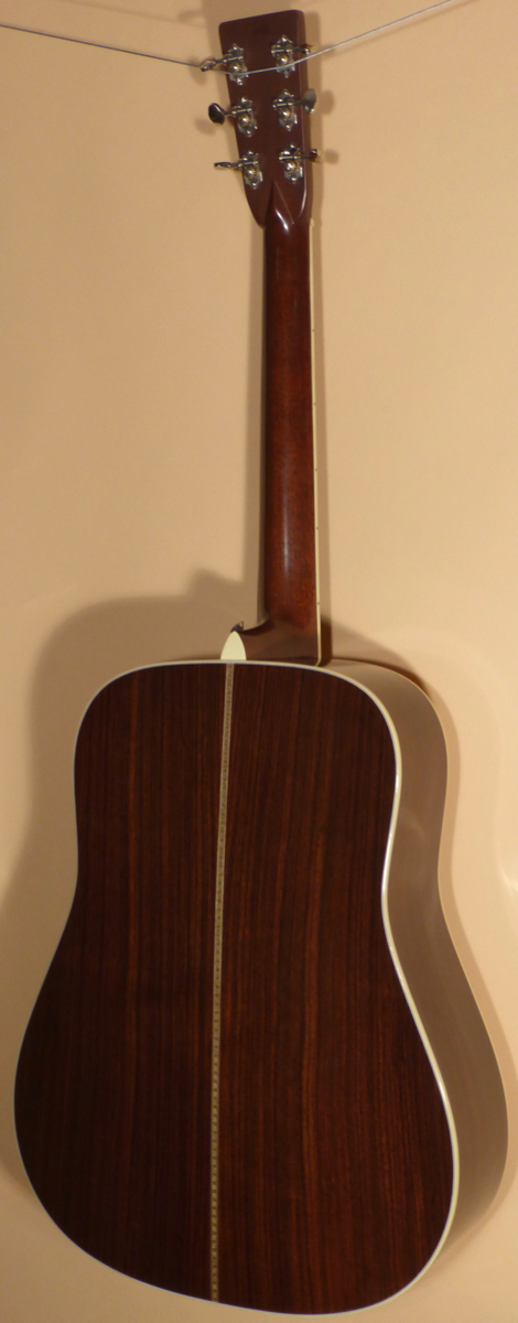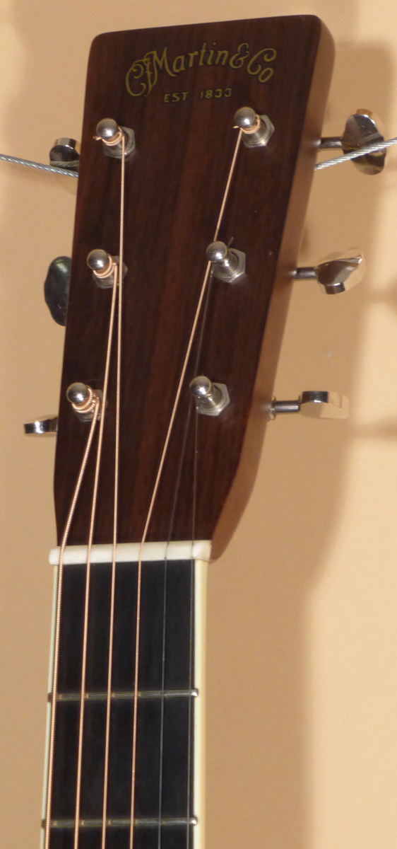 The Rosewood peghead overlay features the “Martin & Co. EST. 1833” decal at the top. Nickel Waverly tuners with lobed buttons. Bone nut. The ivoroid bound Ebony fingerboard has black side dot position markers. The Vintage profile neck is full but comfortable, with a minimal amount of wear. Nickel strap button installed. Ivoroid heelcap.