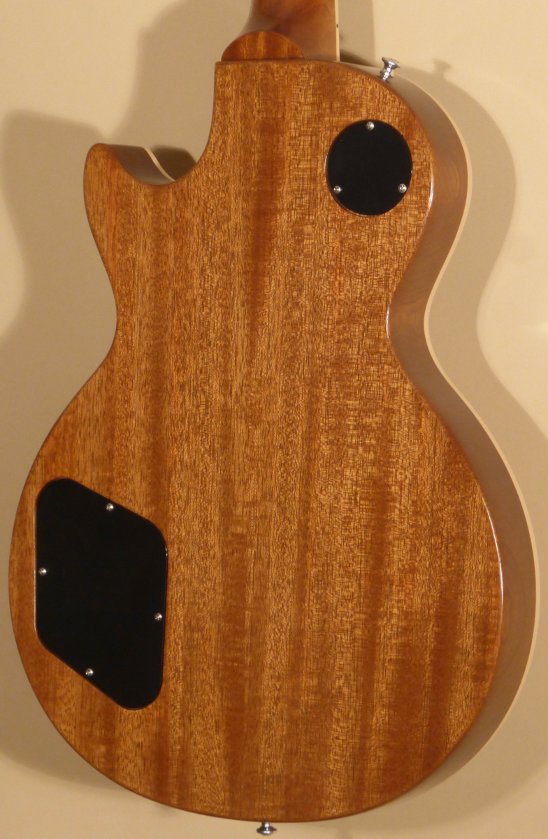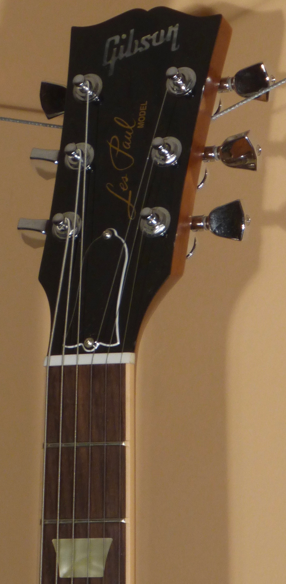 This 2010 Gibson Les Paul Traditional is in really great shape. The Ebony peghead overlay has the Gibson logo at the top inlaid in Mother of Pearl, and a “Les Paul model” script in the center. The back of the peghead shows the serial number stamped at the top and “Made in USA 2010” stamped in the center. Locking Nickel Grove tuners with Nickel buttons. Nice feeling “D” profile neck with no dings or scratches. The Rosewood fingerboard has M.O.P trapezoid inlays and black side dot position markers on the bass side of the cream binding. Stop tailpiece and two-piece adjustable Nickel bridge.