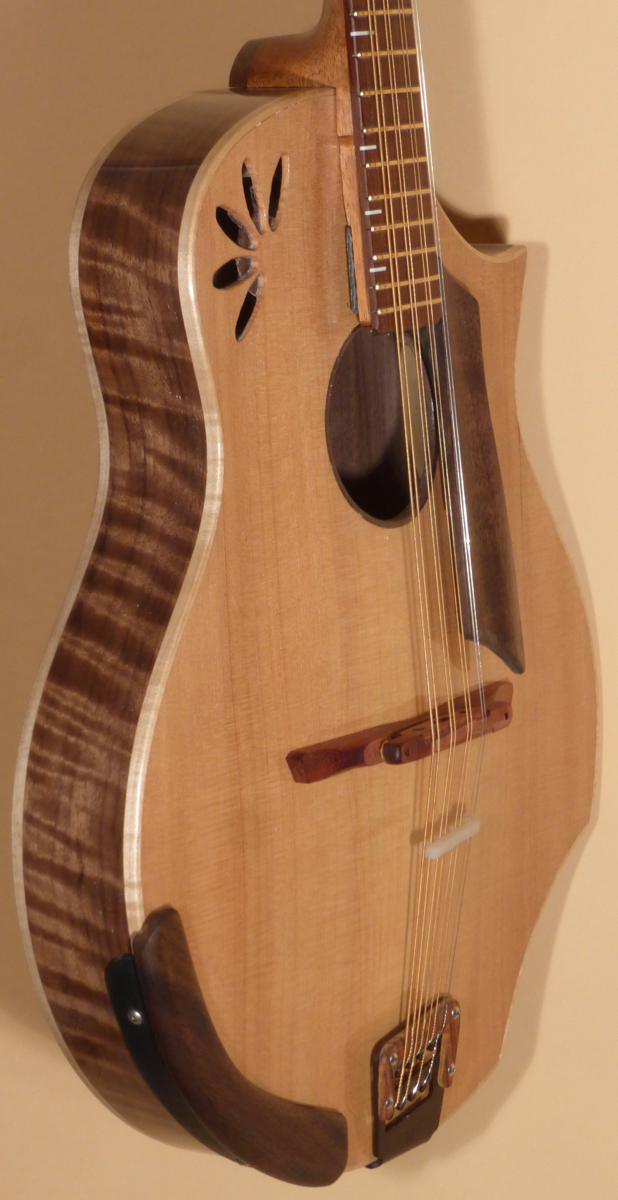 This new Blues Hardware octave mandolin is a unique piece that has a good amount of punch. It has Walnut back and sides, Cedar top, and a rounded “V” profile neck.