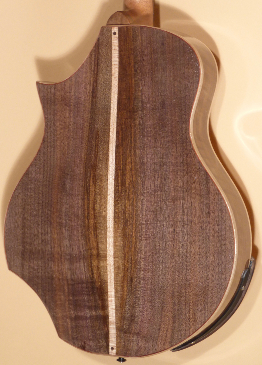 The Cedar top has some beautiful figure. The top has some interesting appointments including: A custom two-piece Bloodwood bridge with gold adjusting screws, a custom alloy and Rosewood tailpiece, a custom Walnut pickguard and armrest, a flower shaped sound port cutout on the bass side of the upper bout, and Maple binding on the top edge. The Walnut back and sides are beautiful. The two-piece Walnut back is separated but a Maple back strip. Maple binding on the back edge.