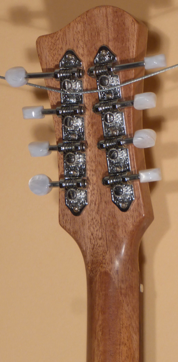 The Maple peghead overlay features the Blues Hardware logo at the top in Rosewood. Nickel four-on-a-plate tuners with pearloid buttons. Bone nut. The Rosewood fingerboard features the signature Blues Hardware strip inlays that also act as the side position markers. The generous “C” profile Mahogany neck in shaped very nicely all the way up. Walnut heelcap.