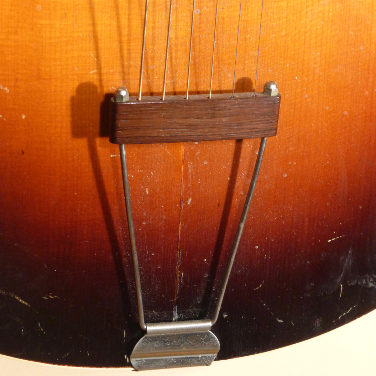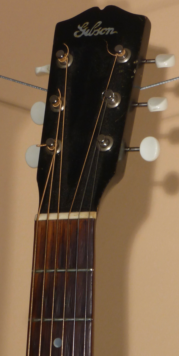 The darkened peghead features “Gibson” inlaid at the top in pearl. Replacement Kluson Deluxe 3-on-a-plate tuners with white buttons. Bone nut. The Rosewood fingerboard features pearl dot inlays and white side dot position markers. The neck is a full “U” profile. The neck has been played on so much that it has worn through the finish on most of the neck, which has caused it to be a “speed neck”. This wear has actually enhanced the comfortability of the neck, and has made it easy for quick chord transitions.